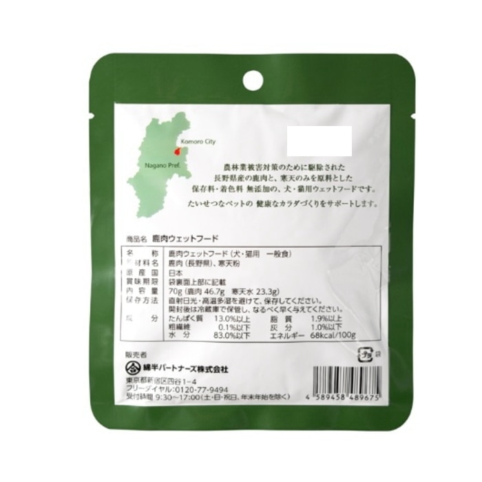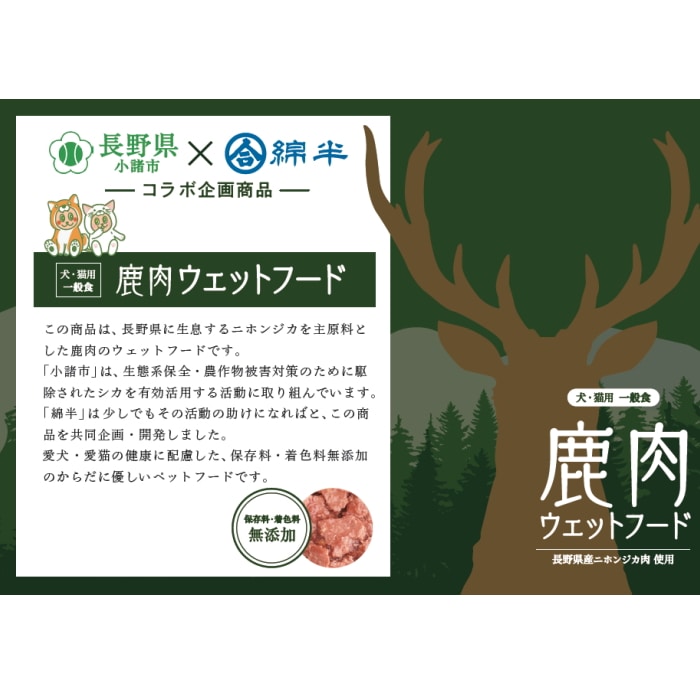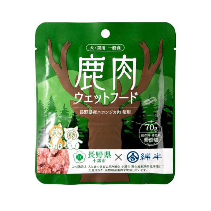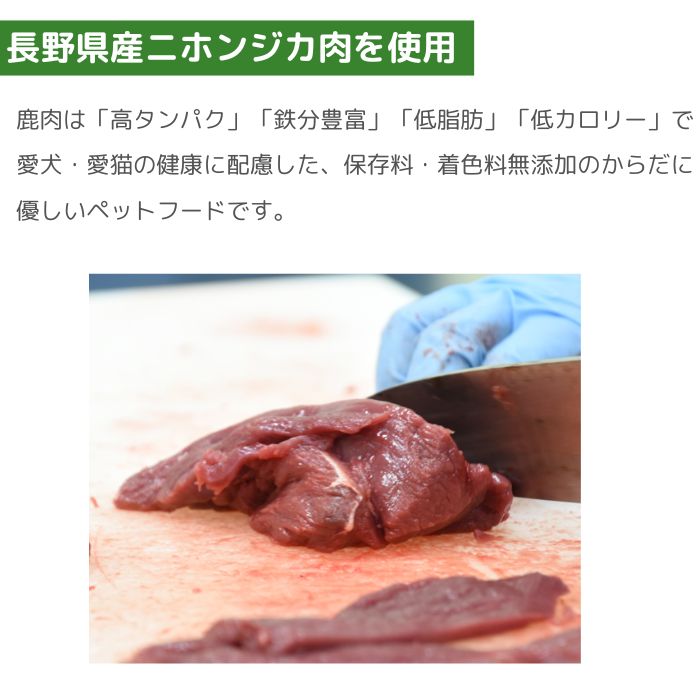 ・長野県産の鹿肉と寒天のみで作った保存料・着色料無添加のやさしいウェットフードです。