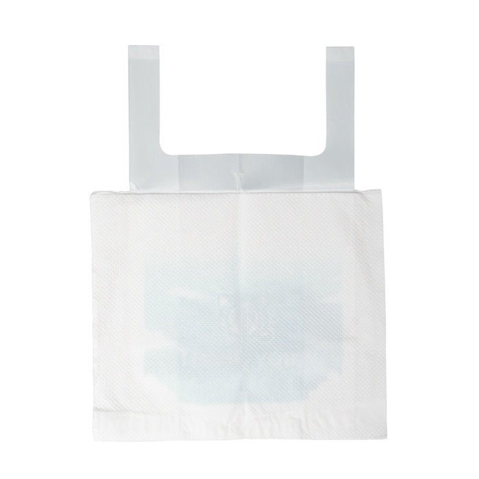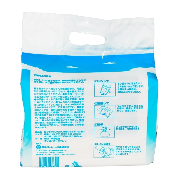 取っ手がついてるから結びやすく、手で持ちやすい。ポリ袋をひっくり返すと、かわいいデザイン。うんちの入った水溶性の紙袋だけ取り出し、トイレに流せます。