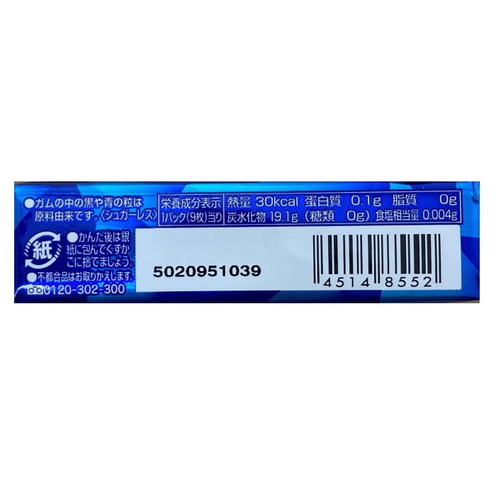 原材料名:マルチトール(外国製造)/甘味料(キシリトール、アスパルテーム・L-フェニルアラニン化合物)、ガムベー ス、香料、増粘剤(アラビアガム)、光沢剤、リン酸一水素カルシウム、フクロノリ抽出物、着色料(紅花黄、 クチナシ)、ヘスペリジン、(一部にゼラチンを含む)