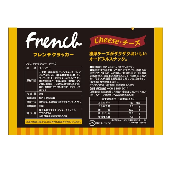 原材料名:小麦粉、植物油脂、コーンスターチ、じゃがいもでん粉、ぶどう糖果糖液糖、砂糖、チェダーチーズ、チーズパウダー、ホエイパウダー(乳成分を含む)、食塩、酵母/調味料(アミノ酸)、膨張剤、リン酸Ca、酸味料、乳化剤、香料、微粒酸化ケイ素、着色料(アナトー、カロテン)