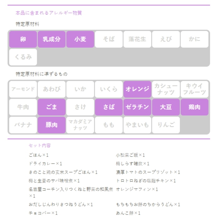 アレルゲン:卵・乳成分・小麦・オレンジ・ごま・さば・大豆・鶏肉・豚肉