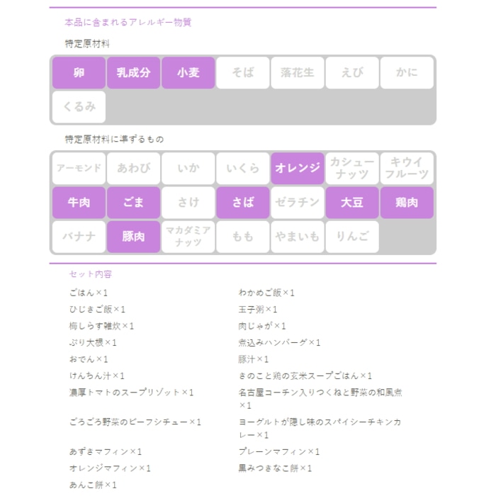 内容:ごはん100g・ひじきご飯100g・わかめご飯100g・玉子粥360g・梅しらす雑炊360g・おでん330g・肉じゃが200g・豚汁300g・ぶり大根200g・煮込みハンバーグ190g・けんちん汁310g・きのこと鶏の玄米スープごはん265g・濃厚トマトのスープリゾット265g・名古屋コーチン入つくねと野菜の和風煮210g・ごろごろ野菜のビーフシチュー200g・ヨーグルトが隠し味のスパイシーチキンカレー260g・あずきマフィン(2個入)・プレーンマフィン(2個入)・オレンジマフィン(2個入)・黒みつきなこ餅148g・あんこ餅153g各1個