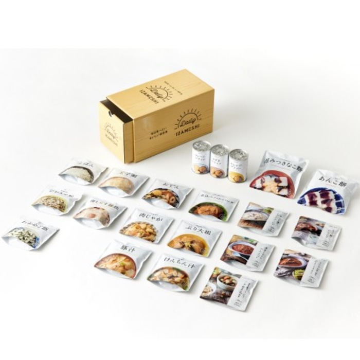 「デイリーイザメシ」は1人3日分の保存食セット。ごはん7種、おかず9種、パン3種、スイーツ2種が各1個、合計21個入っています。災害時の非常食としてはもちろん、ご家庭のランチ、職場の残業飯などにも。ボックスは普段使いができる引き出しタイプ。保存食というと棚の奥にしまわれがちですが、シンプルで明るいデザインなので、インテリアに自然に溶け込みます。食べたら補充するローリングストックにも便利です。大切な人の「いざ」の場面で活躍する「イザメシ」は、贈り物にもおすすめです。