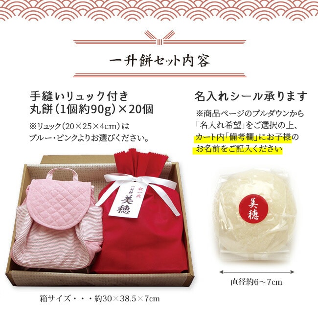| セット内容 | 餅×20個入(1個あたり 約90g)、リュック×1個 |