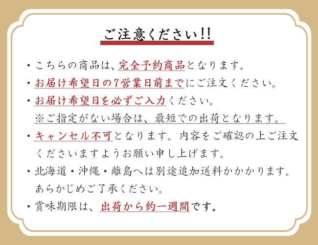 | 追加送料 | 北海道・九州・四国へのお届けはプラス400円、沖縄へのお届けはプラス1,100円の追加送料を別途頂戴いたします。 ※自動返信メールでは送料が追加されませんので、担当者より送料を修正してお送りする「ご注文確認メール」にて金額をお確かめください。 |