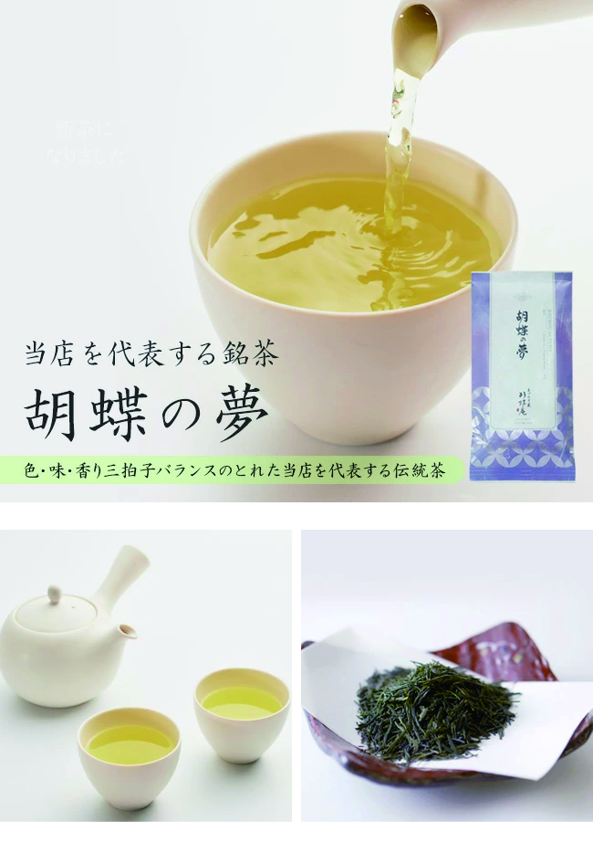 色良し、味良し、香り良し。 初代・三原次郎の俳号「胡蝶」より名が付けられた、伝統ある銘茶『胡蝶の夢』は当店を代表する日本茶です。 とても飲みやすく、毎日飲んでいただけるお茶として、お茶好きの方にご愛飲いただいております。