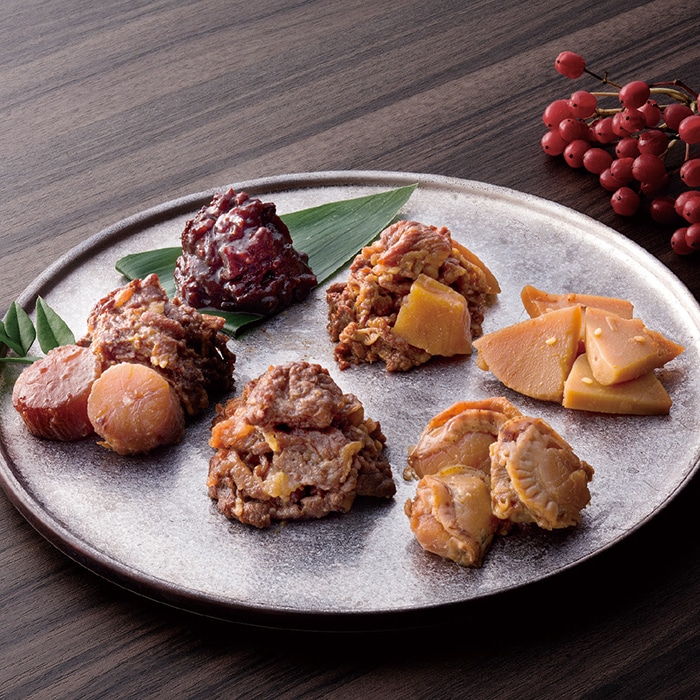内容:減塩牛肉しぐれ50g・減塩牛肉ごぼうしぐれ50g・竹の子旨煮50g・帆立うすだき40g・そぼろ味噌味あわせ90g各1個