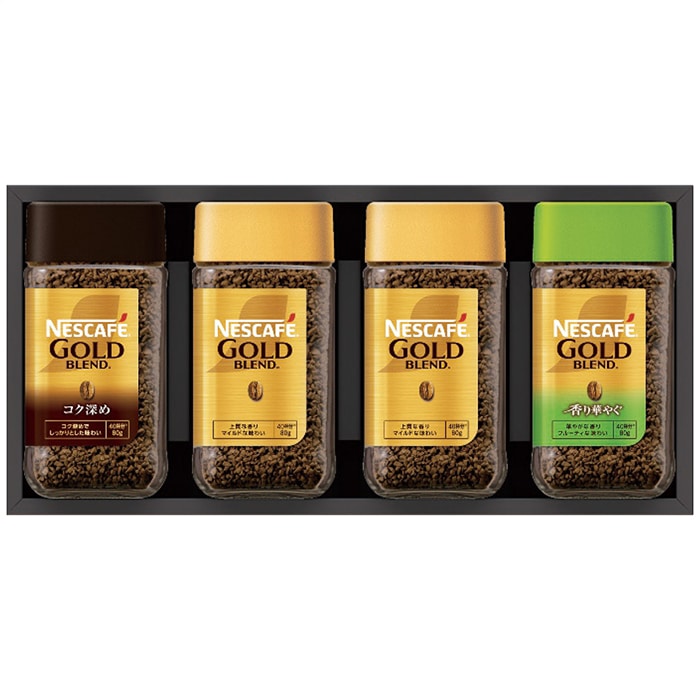 内容:ネスカフェ(ゴールドブレンド2瓶・ゴールドブレンドコク深め・ゴールドブレンド香り華やぐ各1瓶・各80g)