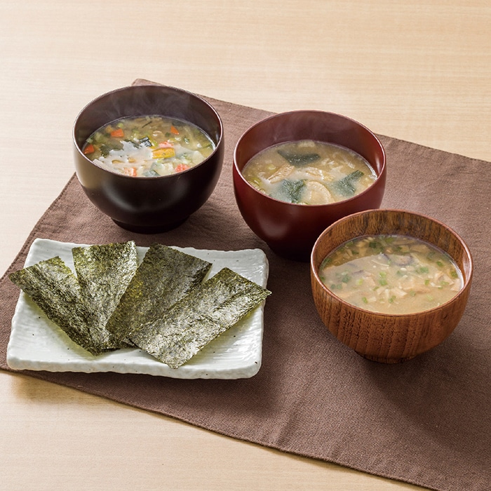お湯を注ぐだけで本格的な味わいのマルコメフリーズドライ味噌汁と、白子有明海産味のり詰合せです。
