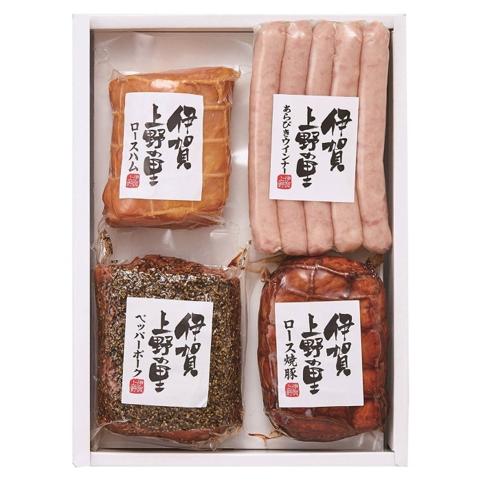 自然豊かな伊賀盆地で一つ一つ丁寧に作り上げました。ロースハム、ロース焼豚、ペッパーポーク、ウインナーのセットです。
