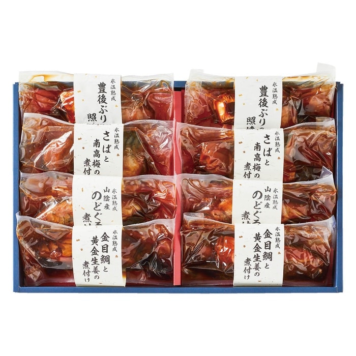内容:金目鯛と黄金生姜の煮付け100g×2、さばと南高梅の煮付け110g×2、豊後ぶりの照焼き90g×2、山陰産のどぐろの煮付け85g×2