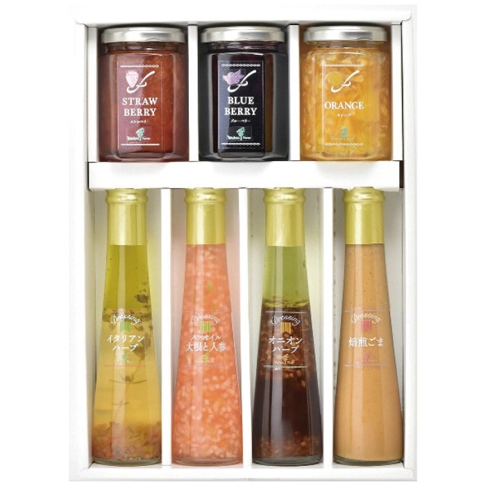 内容:ジャム145g(ストロベリー、ブルーベリー、オレンジ各1個)、ドレッシング122ml(イタリアンハーブ、ノンオイル大根と人参、オニオンハーブ、焙煎ごま各1本)