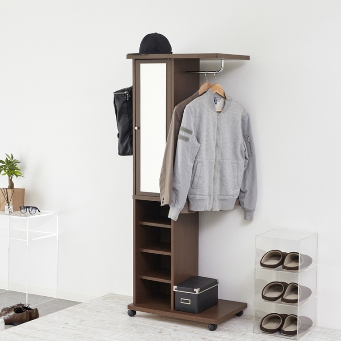 リビングや寝室はもちろん、玄関で上着掛けとしても便利です。 背面化粧仕上げですので置く場所を選ばず、お部屋の間仕切りとしても使えます。 組立の際、収納部分とハンガー部分を、お好みで左右逆にできる仕様です。