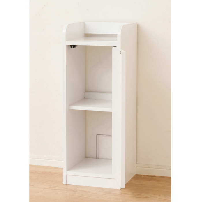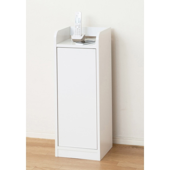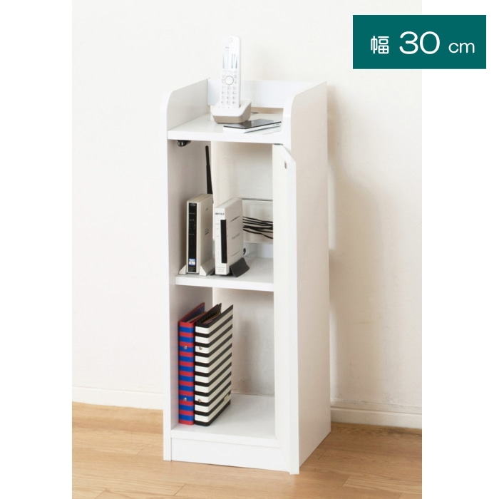 幅が約30cmとスリムなので、お部屋のスミや家具のスキマに設置できます。扉内はモデムやルーター、光電話の機器、タップなどまとめて収納でき、乱雑になりがちなコードをスッキリ整理できます。またA4ファイルや電話帳を立てて収納することもできます。