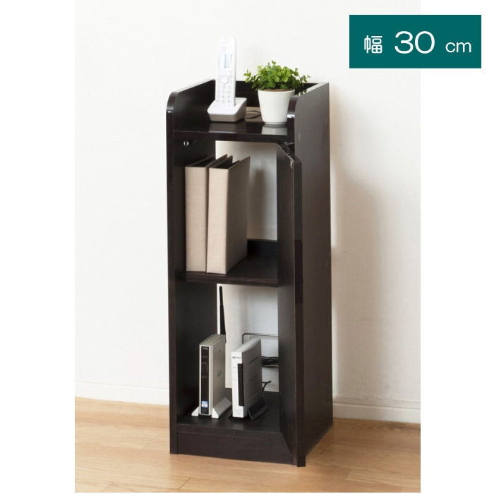 幅が約30cmとスリムなので、お部屋のスミや家具のスキマに設置できます。扉内はモデムやルーター、光電話の機器、タップなどまとめて収納でき、乱雑になりがちなコードをスッキリ整理できます。またA4ファイルや電話帳を立てて収納することもできます。