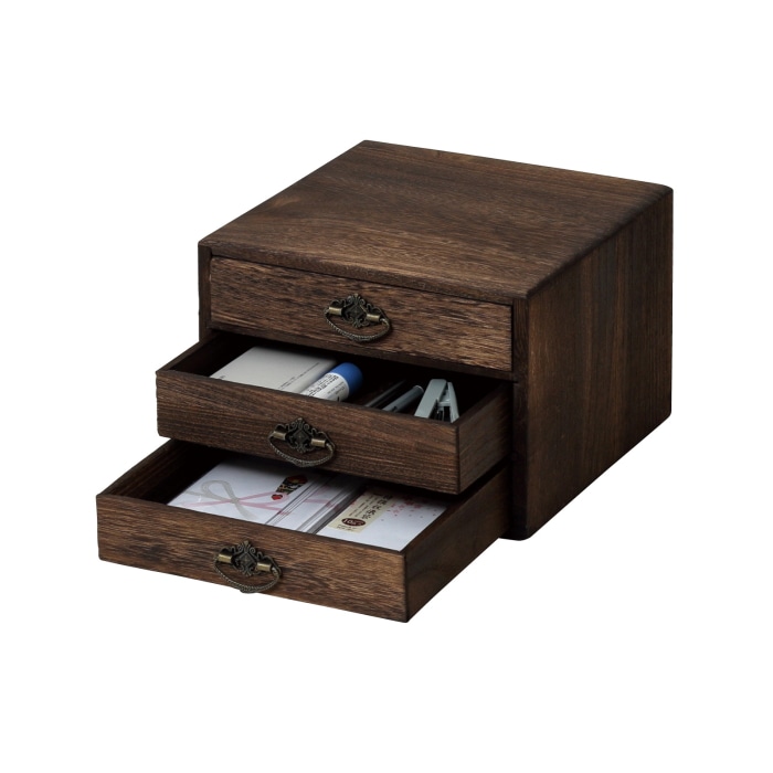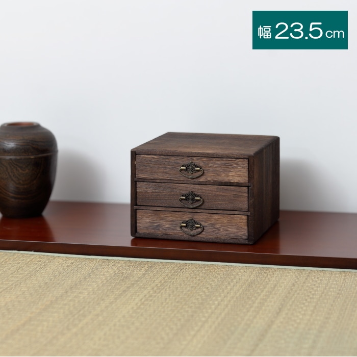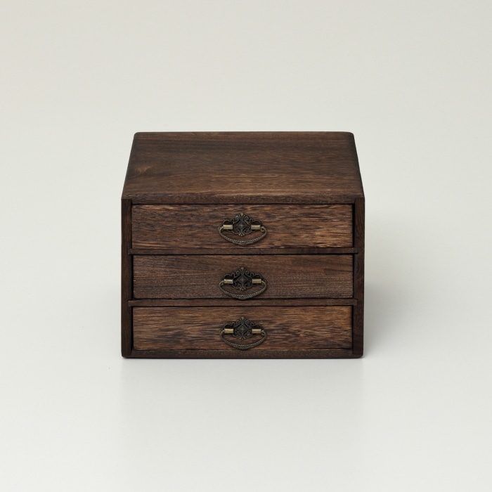 焼くことで独特の風合いと耐久性を向上させた桐材を使用した収納ボックスです。 3杯の引き出しで小物を分類して収納が可能。背面処理済みで設置場所を選びません。 約1㎏と軽量な完成品で卓上や箪笥の上など、和室・洋室問わず幅広く活躍するコンパクトサイズです。 レトロな取手付き。