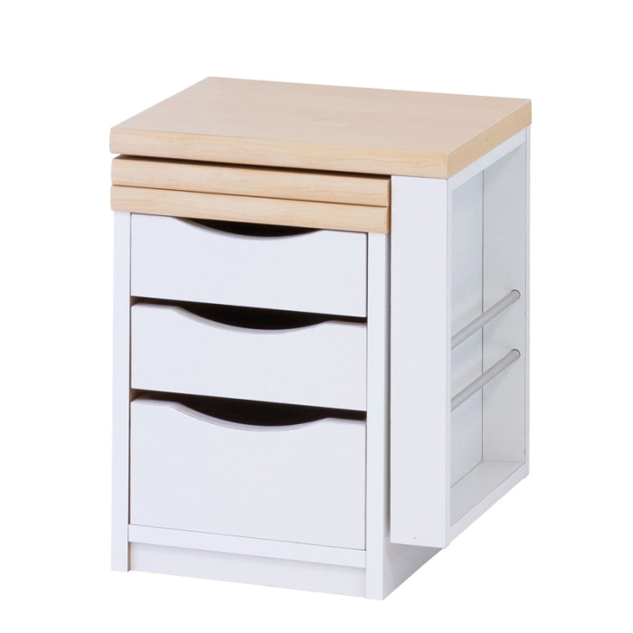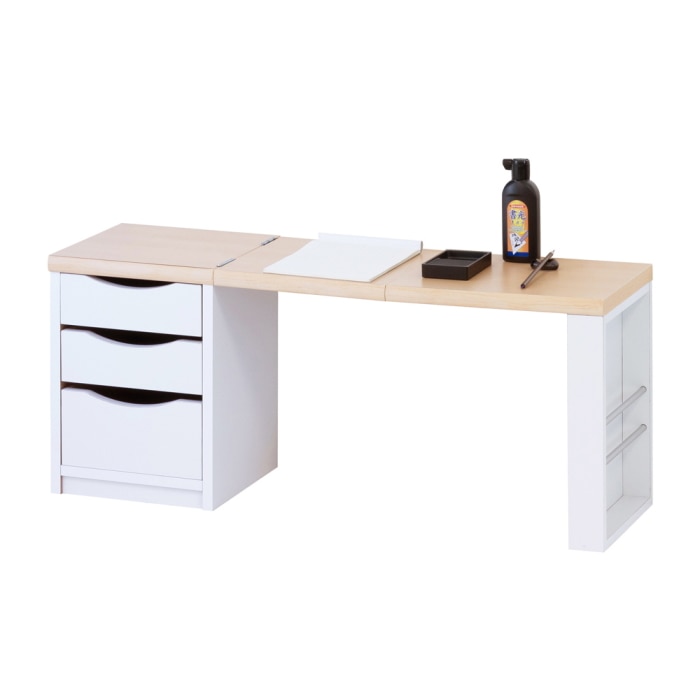天板を折りたためば幅34cmと場所をとらず、必要なときに広げるだけで机になります。 小物整理に便利な引出しは、両面から使える仕様です。 大人から子どもまでお使いいただけるシンプルデザイン&カラー、和室・洋室を問わず色々な使い方ができます。