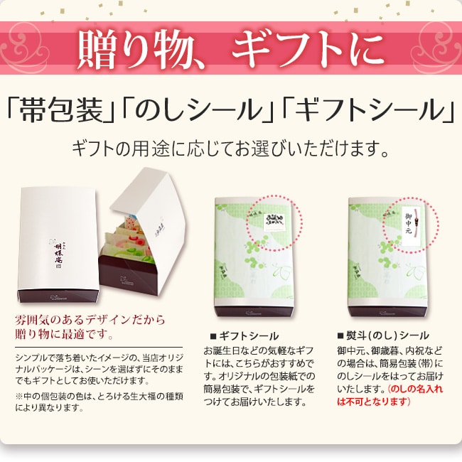 | のし・包装 | ・当店オリジナルパッケージです。 ・帯包装を承ります。 ・ご希望で手提袋(半透明)をおつけできます。 |