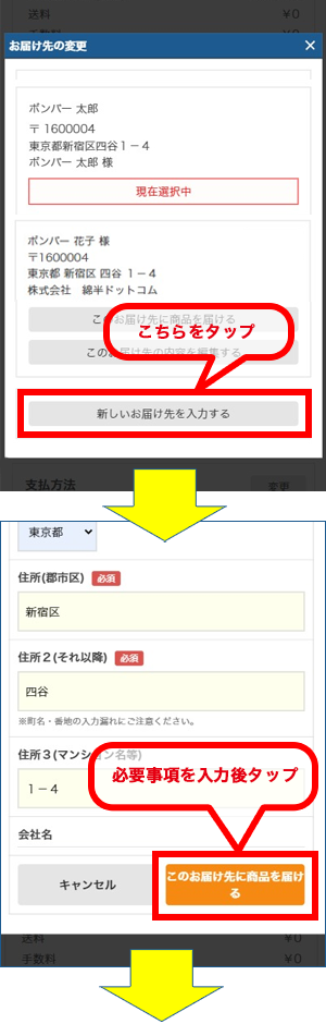 「新しいお届け先を入力する」ボタンを押下し、表示されたご入力欄へお届け先情報をもれなくご入力ください。