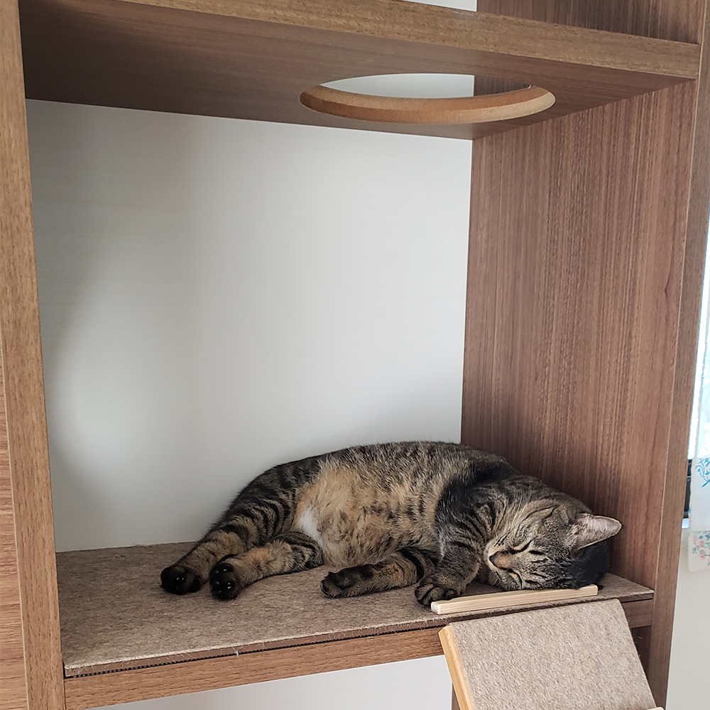 大きな商品なので猫ちゃんにはとても充実した場所になっています。(うちではスロープを自作してみましたが、壁にステップなど付けたり色々な工夫でより猫ちゃんが楽しめる場所になる事間違いないです!)