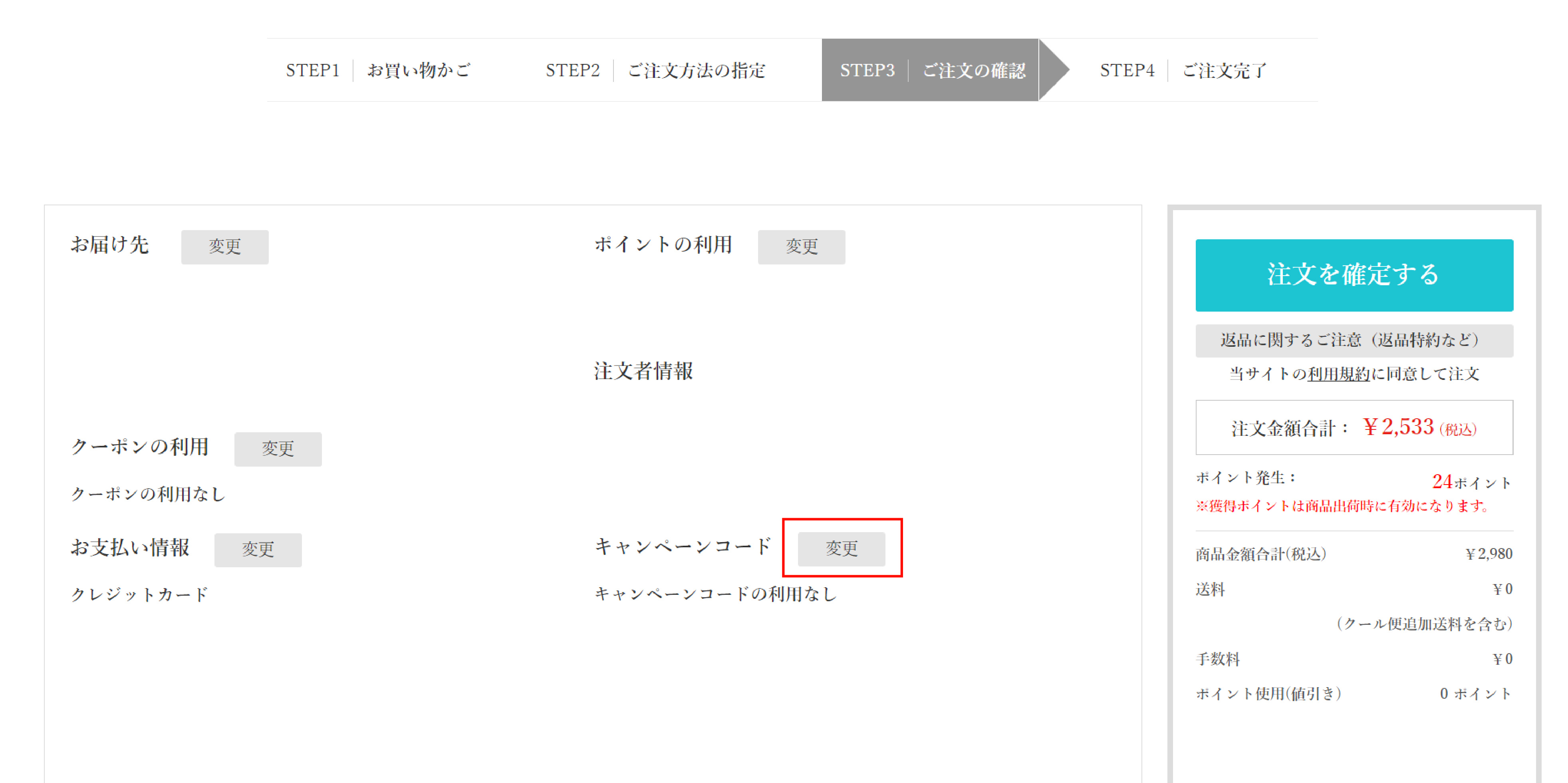 お買い物かご内キャンペーンコード横の「変更」ボタンを選択。