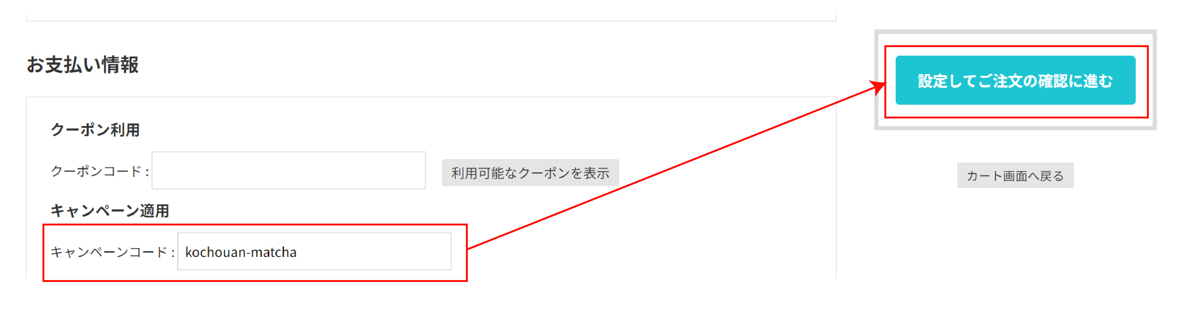 キャンペーンコード欄にコードを入力し、「設定してご注文の確認に進む」を選択。