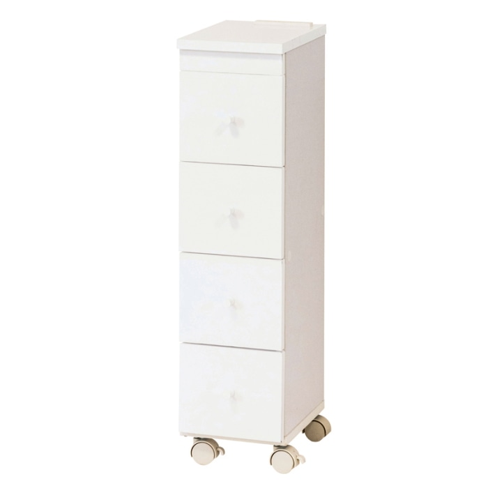 キッチンや洗面所のすきまに収納できるスリムなワゴン、キャスター付で移動ラクラク。
