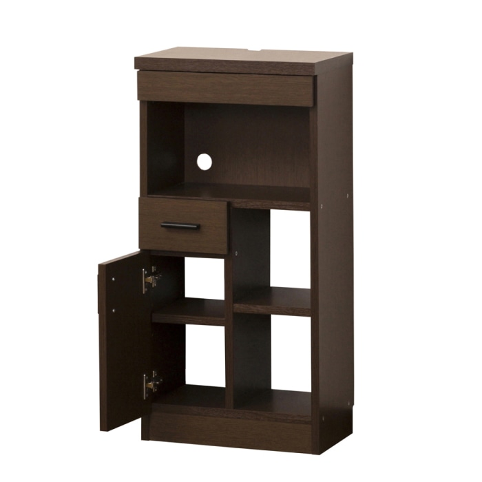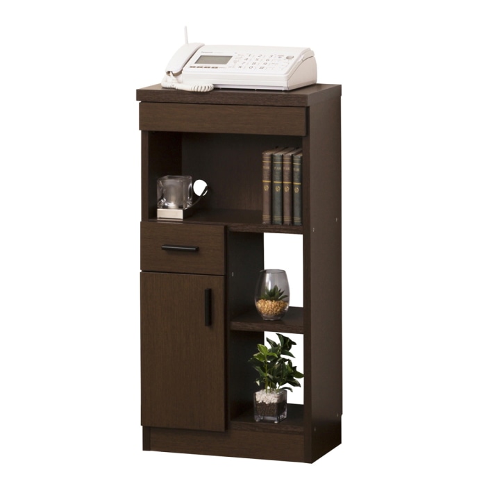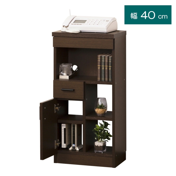 コンパクトサイズなので、場所をとらず圧迫感がありません。 上部引出はA4書類が収納でき、天板奥はコードを通すスペース、背面下部に巾木よけ(約H8cm)があります。下部は背板のないオープン仕様ですので、光電話の機器やルーターを収納したときに配線がスムーズです。