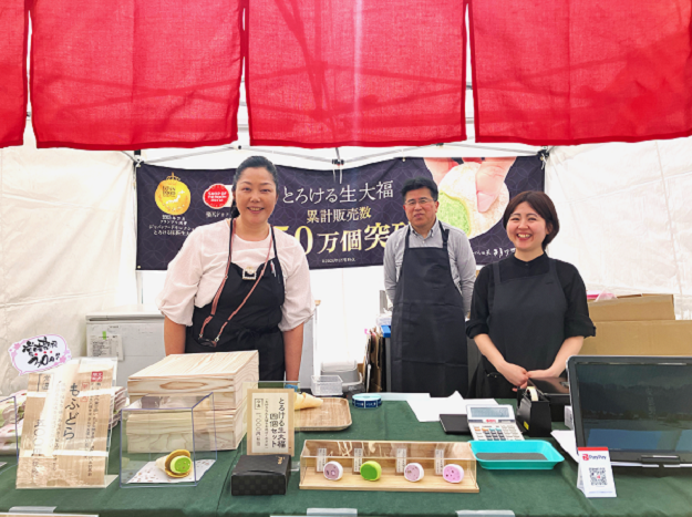 今回が関東圏対面催事初出店となり、代表銘菓「とろける生大福」をはじめ、季節商品「桜餅道明寺抹茶餡」「胡蝶やわらか団子(さくら餡・抹茶餡)」、そして満を持して新発売した「もちっとふわっとした生大福をはさんじゃいましたどら焼き」略して「もふどら」を販売しました。