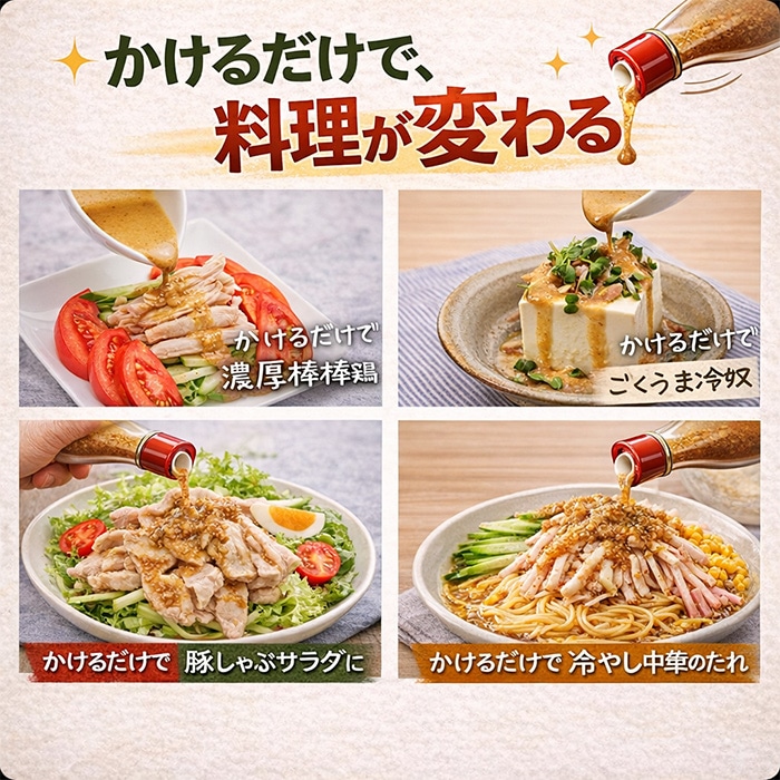 原材料名:食用菜種油(国内製造)、砂糖、ねりごま、ごま、しょうゆ、本みりん、たん白加水分解物、卵黄、醸造酢、食塩、にんにく、豆板醤/アルコール、増粘多糖類、( -部に卵・小麦・大豆・ごまを含む)