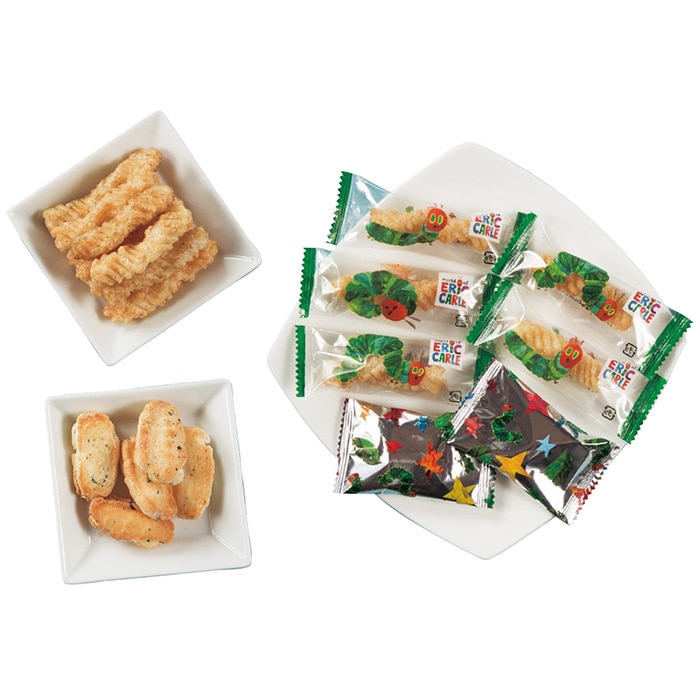 絵本「はらぺこあおむし」をモチーフにしたひねり揚げのギフトです、パッケージが絵本のページをめくるようです。