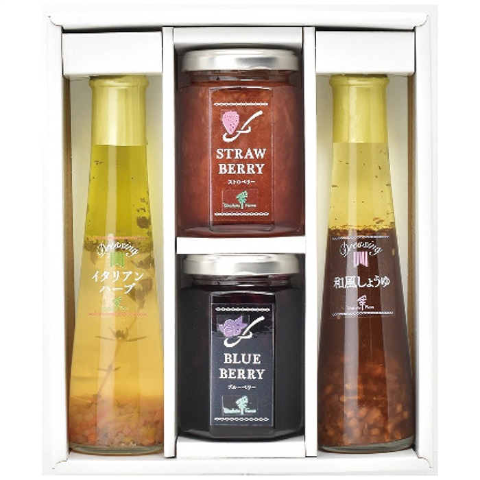 内容:ジャム145g(ストロベリー・ブルーベリー各1個)・ドレッシング122ml(イタリアンハーブ・和風しょうゆ各1本)