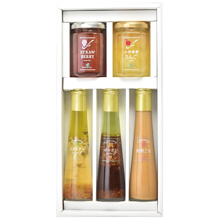 内容:ジャム145g(ストロベリー・りんご各1個)・ドレッシング122ml(イタリアンハーブ・オニオンハーブ・焙煎ごま各1本)
