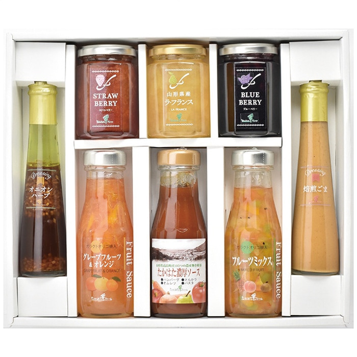 内容:ジャム145g(ストロベリー・ラフランス・ブルーベリー各1個)・ドレッシング122ml(オニオンハーブ・焙煎ごま各1本)・フルーツソース(グレープフルーツ&オレンジ220g・フルーツミックス215g各1本)・ソース210g(たかはた濃厚ソース1本)