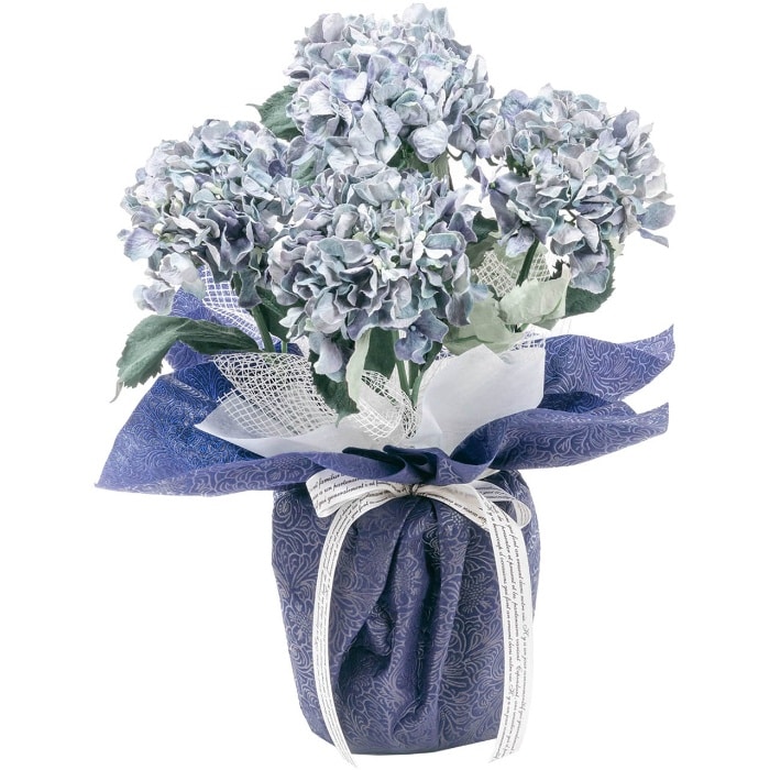 豪華で立派な紫陽花(アジサイ)。水やり不要でお手入れ簡単なので受け取られた方もストレスフリー。空気をきれいにすると言われるSC触媒加工済です。 注意事項 鉢のラッピングは商品の一部となります。商品到着後、鉢のラッピングは外さずにご鑑賞ください。