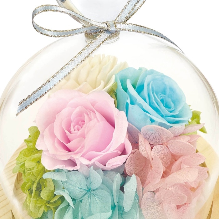 内容:プリザーブドフラワー、ドライフラワー、フローラルフォーム、リボン、ガラス、木