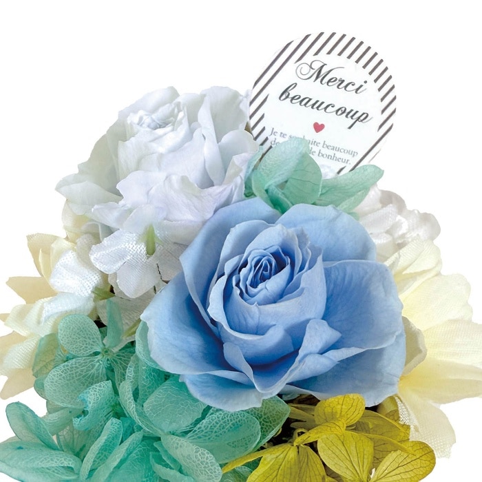 ふんわりとしたボリューム感が魅力のプリザーブドフラワーアレンジメント。ピックには"Meruci"(フランス語でありがとう)のメッセージ入りです。