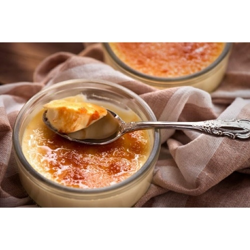 「クレームブリュレ」とはフランス語で「焦がしたクリーム」という意味です。 特別な寒天を使って、濃厚でとろりとしたクリーミーな食感に仕上げました。香ばしく焦がした表面をイメージした、カリカリのクランチがアクセント。